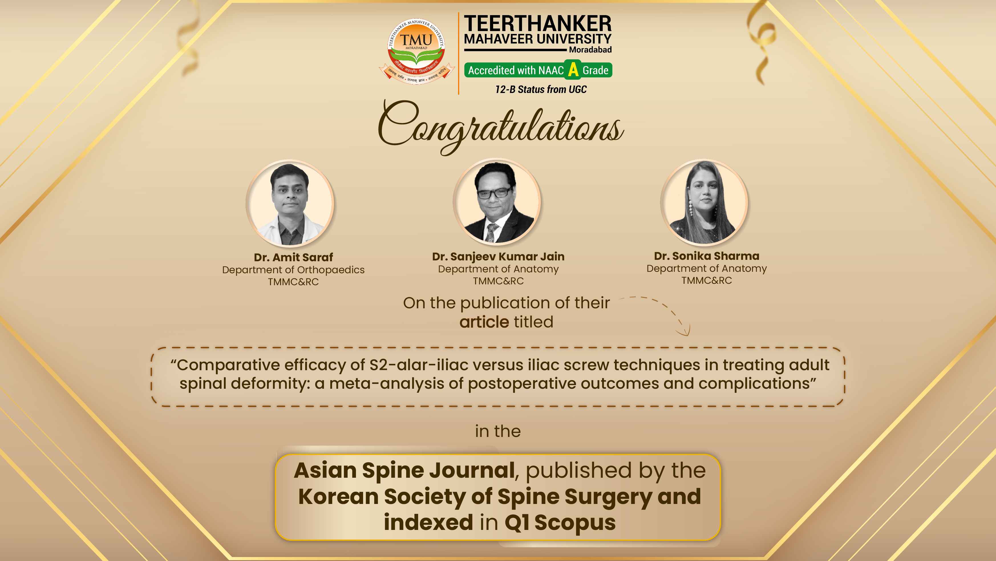 Teerthanker Mahaveer University (TMU), Moradabad, proudly announces that the Asian Spine Journal, a Q1 Scopus-indexed and internationally acclaimed publication of the Korean Society of Spine Surgery, has published a research article authored by TMU faculty members. This achievement stands as a testimony to the university’s commitment to advancing knowledge and fostering impactful research in medical sciences.