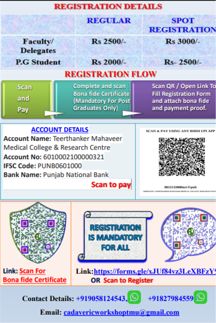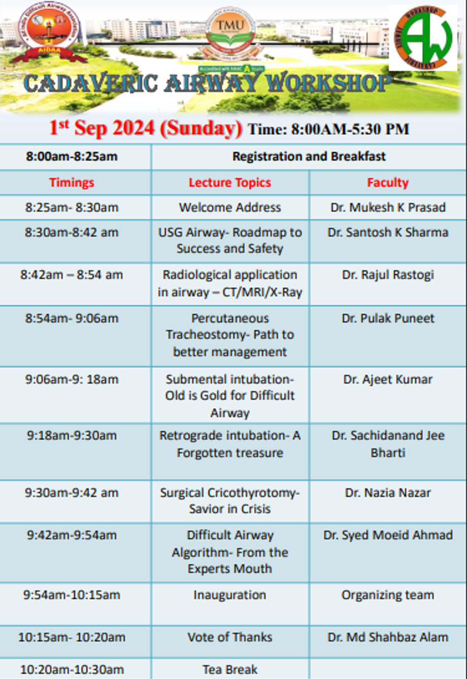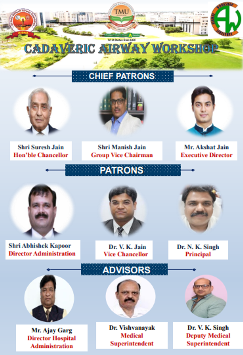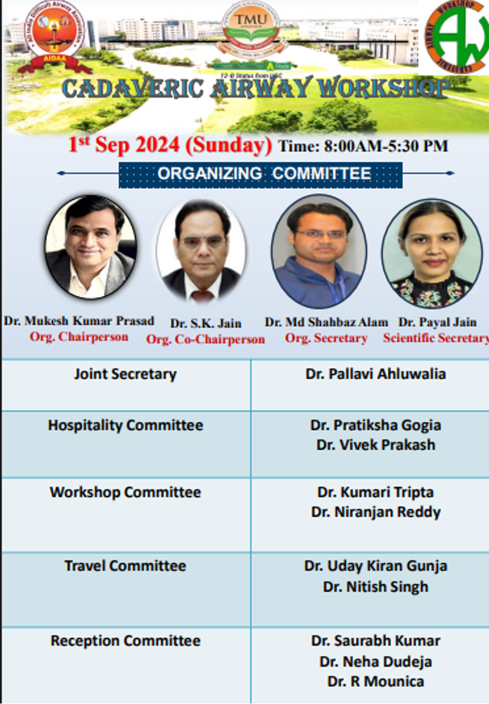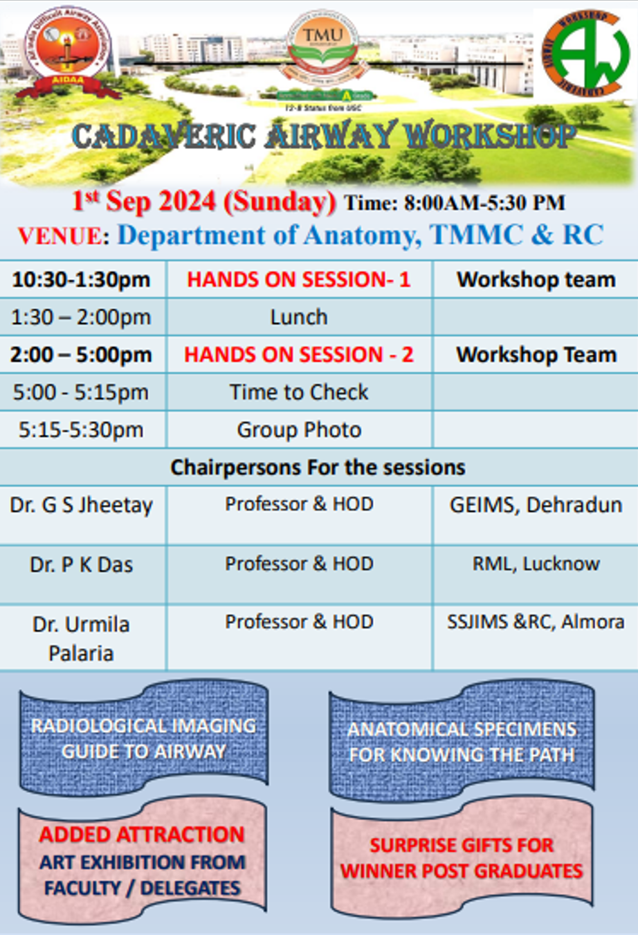 The Department of Anesthesia, in collaboration with the Department of Anatomy, Teerthanker Mahaveer Medical College & Research Centre, successfully organized a one-day Cadaveric Airway Workshop on 1st September 2024. The event aimed to enhance clinical competence in airway management through hands-on training using specially embalmed cadavers, providing participants with a near-real, live-like learning experience. The workshop commenced with registration and a welcome address by Dr. Mukesh Kumar Prasad, Organizing Chairperson. The inaugural session was graced by distinguished faculty and university leaders under the patronage of Hon’ble Chancellor Shri Suresh Jain, Group Vice Chairman Shri Manish Jain, and Vice Chancellor Dr..V.K. Jain. Eminent experts from premier medical institutions including AIIMS, AMU, HIHT, Subharti, SRMS, and LLRM Medical College delivered insightful lectures covering diverse aspects of airway management such as USG airway mapping, radiological imaging, percutaneous tracheostomy, submental and retrograde intubation, and surgical cricothyrotomy.