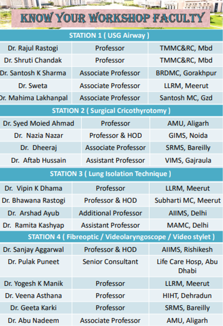 Following the lecture series, participants engaged in two extensive hands-on sessions, where they practiced advanced airway procedures under direct supervision of national faculty at eight specialized skill stations. Each station was designed to emphasize practical learning, covering domains like supraglottic airway techniques, fibreoptic and video laryngoscopy, lung isolation, and tracheostomy.