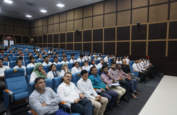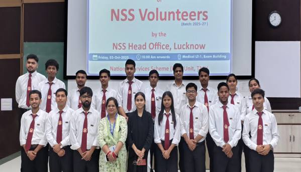 The event saw active participation from a large group of students seated inside a spacious university auditorium. The volunteers, dressed in their official attire, attended the session with enthusiasm and attention, displaying their commitment to the National Service Scheme’s mission. Group photographs further highlight the unified spirit among the batch, with faculty members prominently guiding and encouraging students.