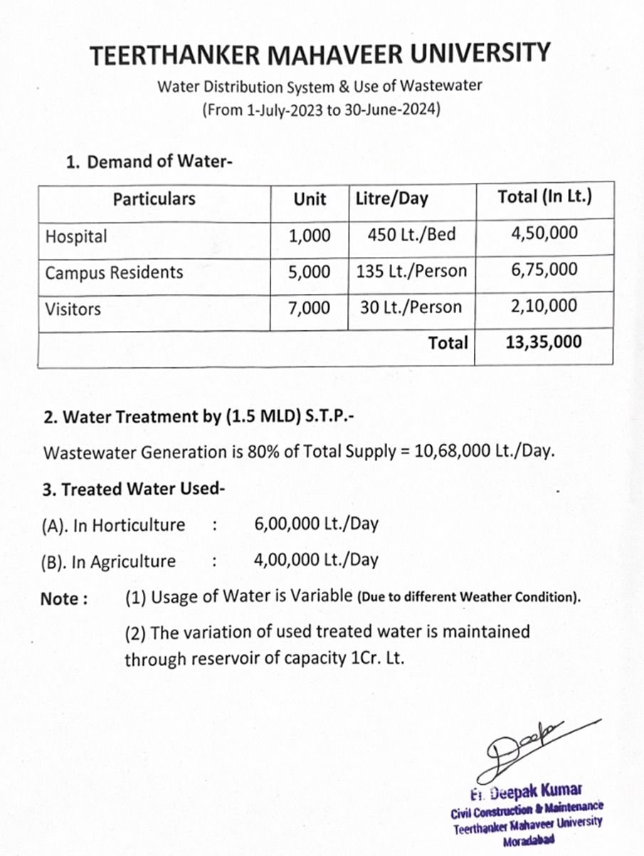 Efficient and transparent tracking of campus water consumption is a cornerstone of Teerthanker Mahaveer University’s commitment to Sustainable Development Goal 6 (SDG 6: Clean Water and Sanitation), specifically addressing indicator 6.2.1.