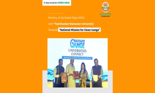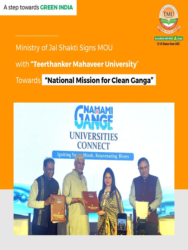 Teerthanker Mahaveer University is pleased to announce the MoU signing with the Ministry of Jal Shakti, Government of India, under the webinar series ‘Igniting Young Minds: Rejuvenating Rivers’ organized by the National Mission for Clean Ganga. Dr. Manjula Jain, Dean of Academics, represented Teerthanker Mahaveer University at the prestigious Namami Gange Universities Connect Conclave. The MoU aims to bring the student community to the forefront of the mass movement for creating a sustainable ecosystem of our rivers.