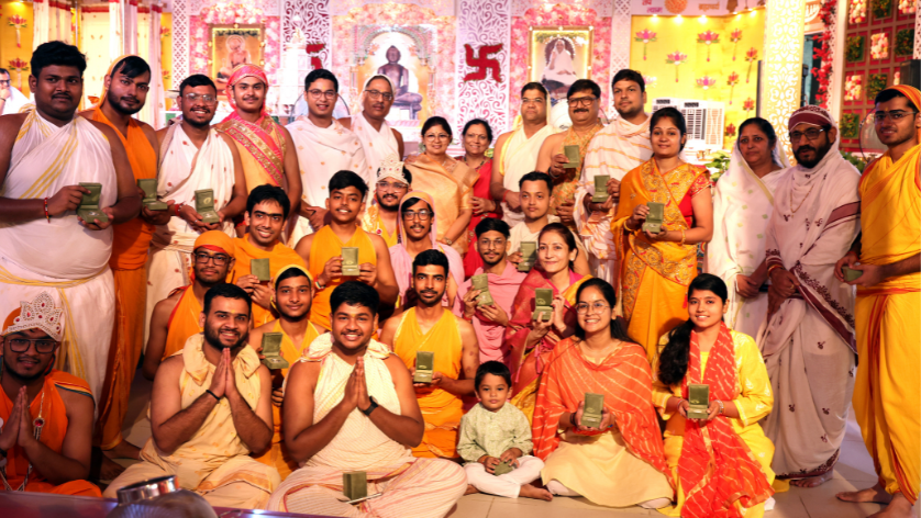 The most touching moment came when the entire Chancellor’s family, including Shri Suresh Jain, Smt. Veena Jain, Shri Manish Jain, Smt. Richa Jain, Shri Akshat Jain, and Smt. Jahnvi Jain personally performed “Parna” (breaking the fast) for those who observed 10 days of fasting. This emotional scene left a lifelong imprint on the devotees present.