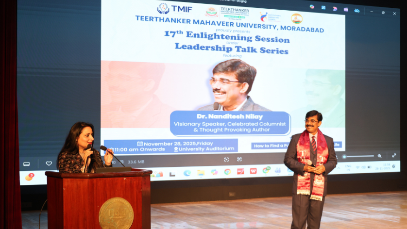 Teerthanker Mahaveer University (TMU), Moradabad, successfully organised the 17th session of the Leadership Talk Series (LTS) on 28th November 2025, centred on the theme “How to Find a Purpose in Professional Life.” The session was delivered by Dr Nanditesh Nilay, one of India’s most influential contemporary thought leaders, a visionary speaker, acclaimed columnist, and author, widely respected for his work on human values, leadership, and ethics.