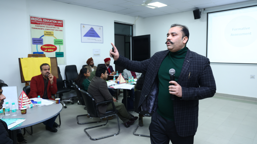 Special emphasis was placed on internal and formative assessment, MCQ and essay question writing, clinical and practical skill assessment, lesson planning, and alignment of competencies with teaching–learning methods and assessments. New curriculum components such as early clinical exposure, electives, skill assessment, and integration were discussed in detail through interactive sessions and group activities.