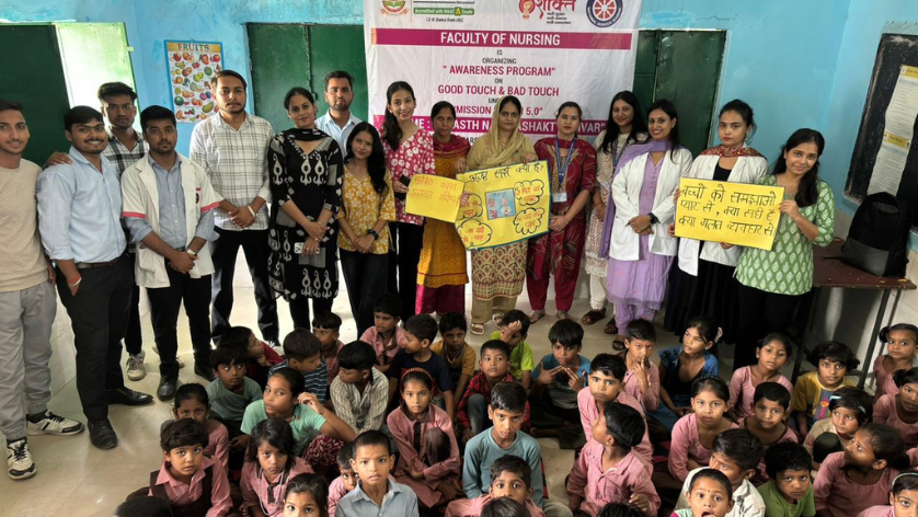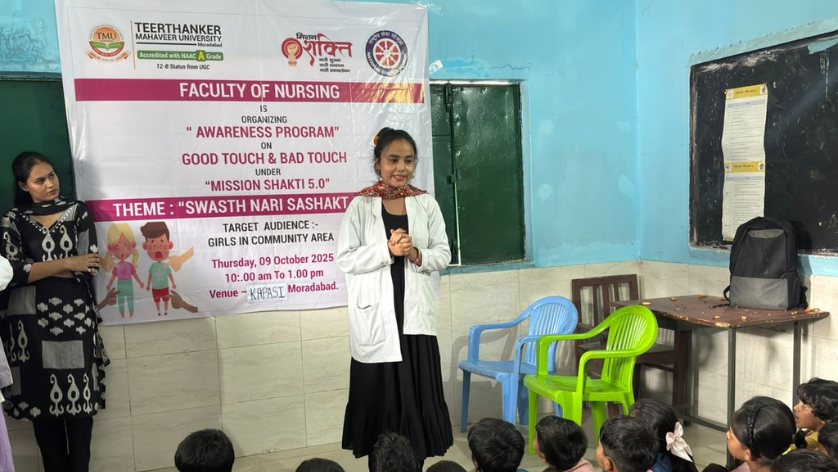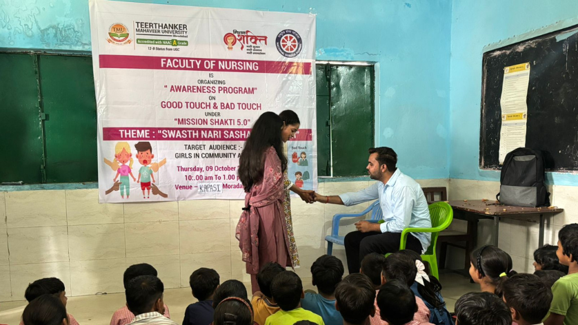 Under the Mission Shakti 5.0 initiative, the Department of Obstetrics and Gynaecological (OBG) Nursing, Teerthanker Mahaveer University, Moradabad, in collaboration with the Equal Opportunity Cell (EOC), organised a community awareness program on “Good Touch and Bad Touch” at Primary School, Kapasi Village, Uttar Pradesh, on 9 October 2025.