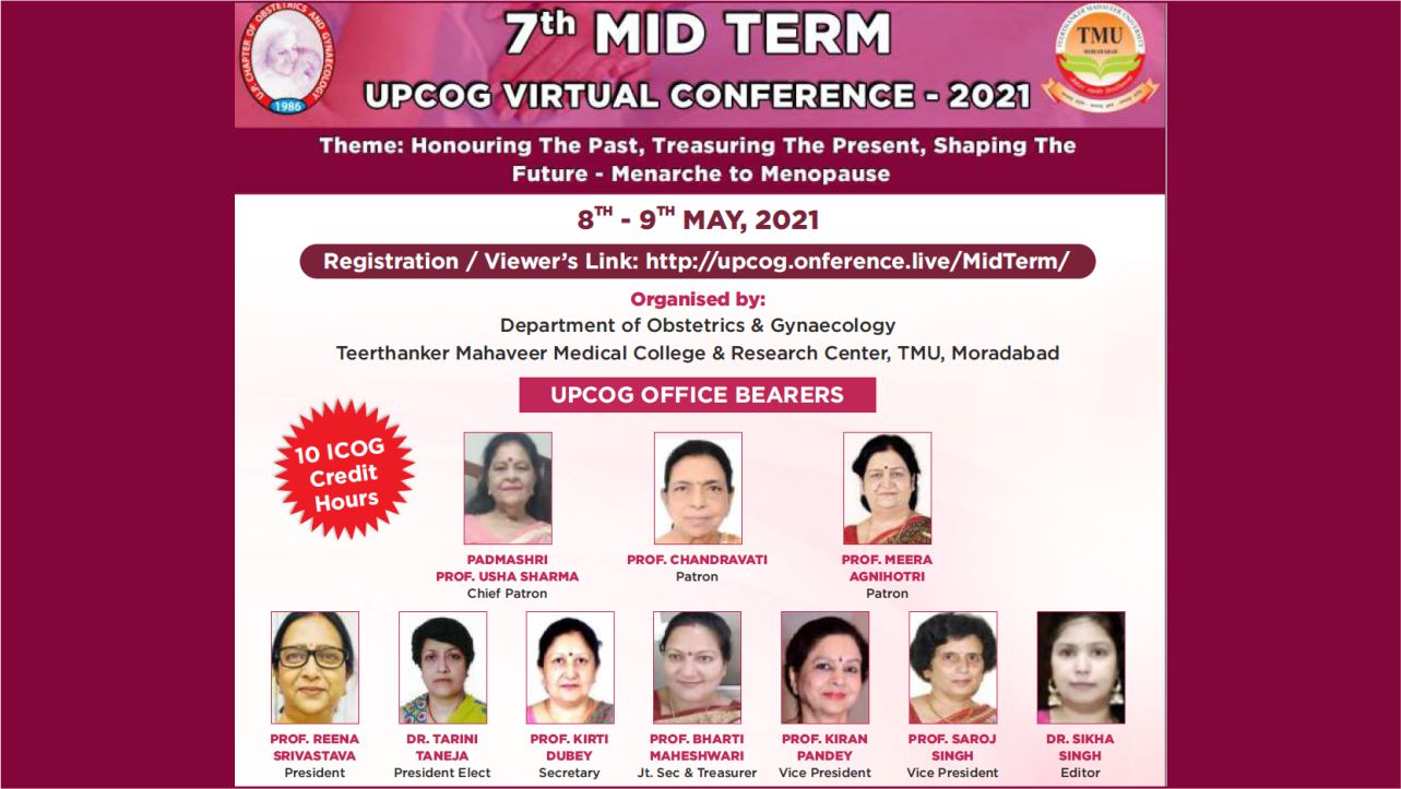 UPMIDTERM annual conference 2021 was hosted Online on 8th & 9th of May by the Department of obstetrics and gynaecology TMMC&RC Moradabad under the aegis of UP Chapter of Obstetrics and Gynaecology with the dynamic Organising chairperson Prof.(Dr)Rehana Najam & worthy organizing secretary Dr Astha lalwani along with workshop coordinators Dr Kanchan Rani & Dr Shubra Agarwal with the organizing team.