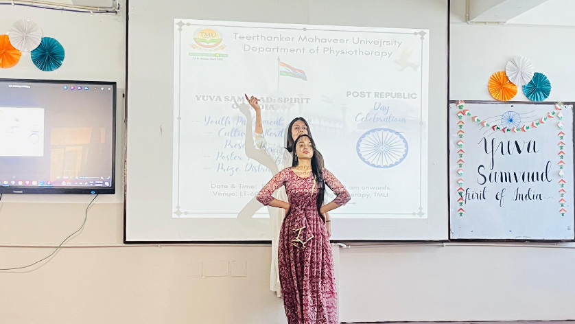 The Department of Physiotherapy at Teerthanker Mahaveer University (TMU) successfully hosted "Yuva Samvaad: Spirit of India 2025" on 3rd February 2025 at LT-603. This intellectually stimulating event aimed to encourage young minds to critically analyse national issues while celebrating India's rich cultural heritage.