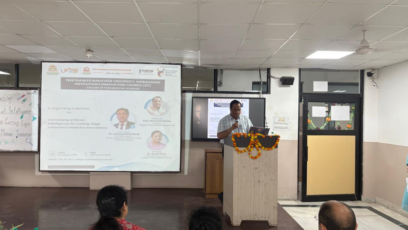 On 23rd August 2025, the Department of Medical Laboratory Techniques, College of Paramedical Sciences, Teerthanker Mahaveer University (TMU), organised a seminar on “Harnessing Artificial Intelligence for Cutting-Edge Laboratory Medicine Innovations”. The seminar was conducted in Room No. 515, 4th Floor, and was attended by 144 participants, including students, faculty members, and scholars.