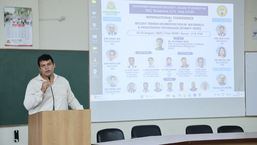 The College of Engineering, Teerthanker Mahaveer University (TMU), Moradabad, successfully concluded its two-day International Conference on Recent Trends on Innovation in Materials and Processing Techniques (RTIMPT-2025). The event brought together academicians, researchers, and industry experts from across India and abroad to deliberate on the latest advancements, challenges, and opportunities in materials and processing technologies.
