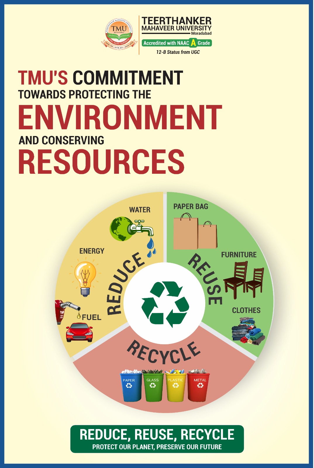 Teerthanker Mahaveer University (TMU), Moradabad, is deeply committed to environmental sustainability and responsible resource management. In alignment with Sustainable Development Goal 6 (Clean Water and Sanitation), the university has adopted a comprehensive Water Reuse Policy to promote efficient water utilization and conservation across its campus.
